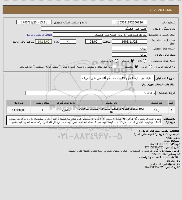 شرح کلی نیاز: عملیات بهسازی کانتر و لاکرهای استخر آکادمی ملی المپیک