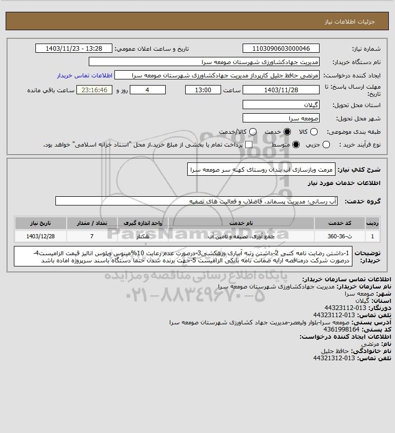 شرح کلی نیاز: مرمت وبازسازی اب بندان روستای کهنه سر صومعه سرا