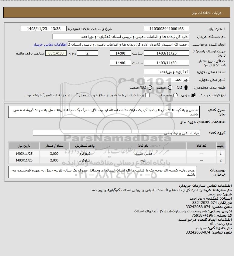 | 1 | -- | عدس خشک | کیلوگرم | 3,000 | 1403/11/25 |