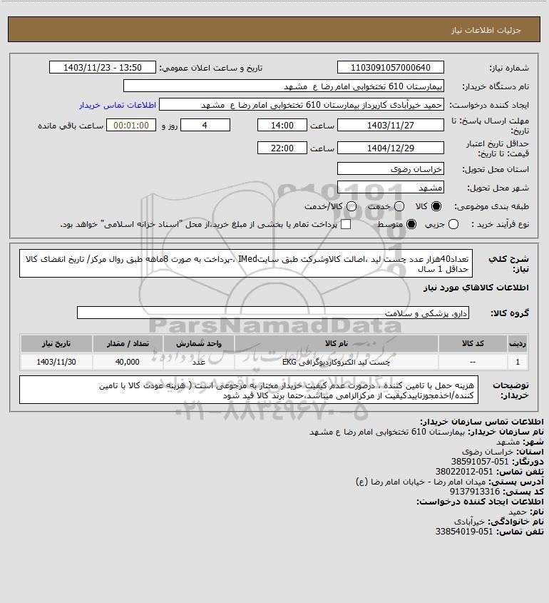 شرح کلی نیاز: تعداد40هزار عدد چست لید ،اصالت کالاوشرکت طبق سایتIMed ،-پرداخت به صورت 8ماهه طبق روال مرکز/ تاریخ انقضای کالا حداقل 1 سال