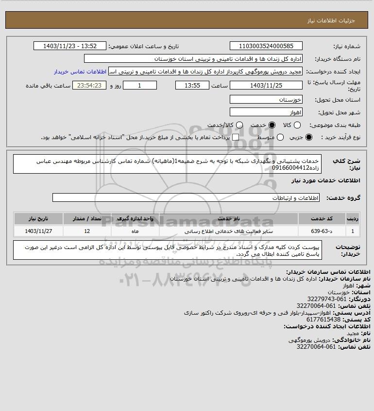 شرح کلی نیاز: خدمات پشتیبانی و نگهداری شبکه با توجه به شرح ضمیمه1(ماهیانه) شماره تماس کارشناس مربوطه مهندس عباس زاده09166004412