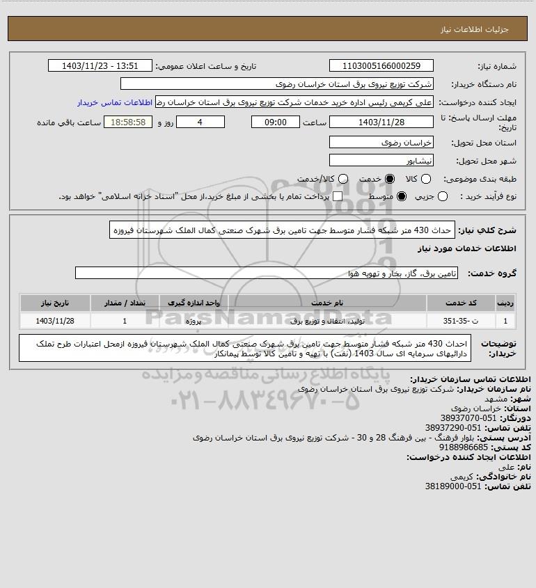 شرح کلی نیاز: حداث 430 متر شبکه فشار متوسط جهت تامین برق شهرک صنعتی کمال الملک شهرستان فیروزه