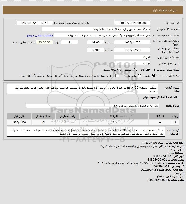 شرح کلی نیاز: اسکنر - تسویه 30 روز اداری بعد از تحویل و تایید - فروشنده باید در لیست حراست شرکت ملی نفت رعایت تمام شرایط پیوست-