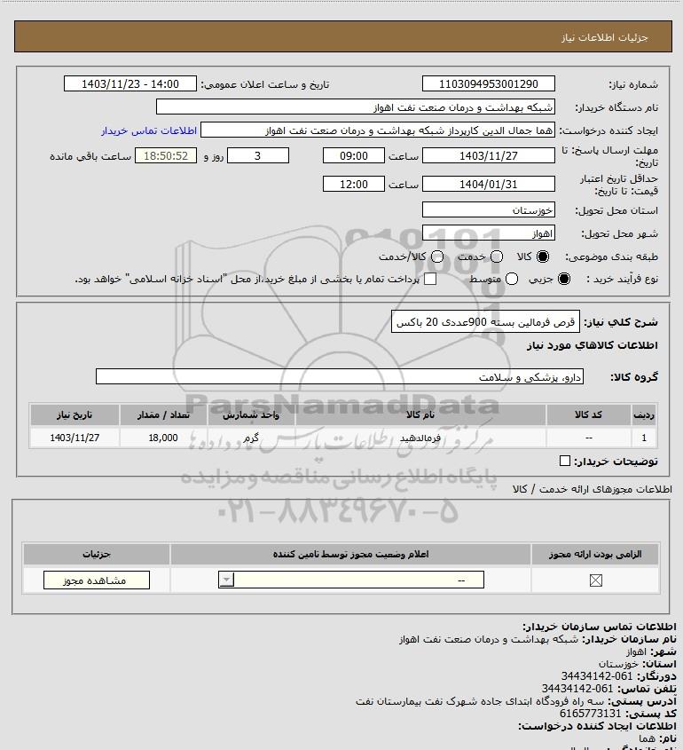 شرح کلی نیاز: قرص فرمالین بسته 900عددی 20 باکس