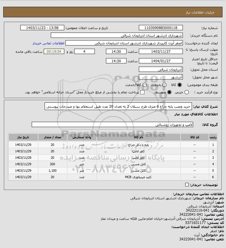 شرح کلی نیاز: خرید ونصب پایه چراغ 6 متری طرح سبلان 2 به تعداد 20 عدد طبق استعلام بها و مندرجات پیوستی