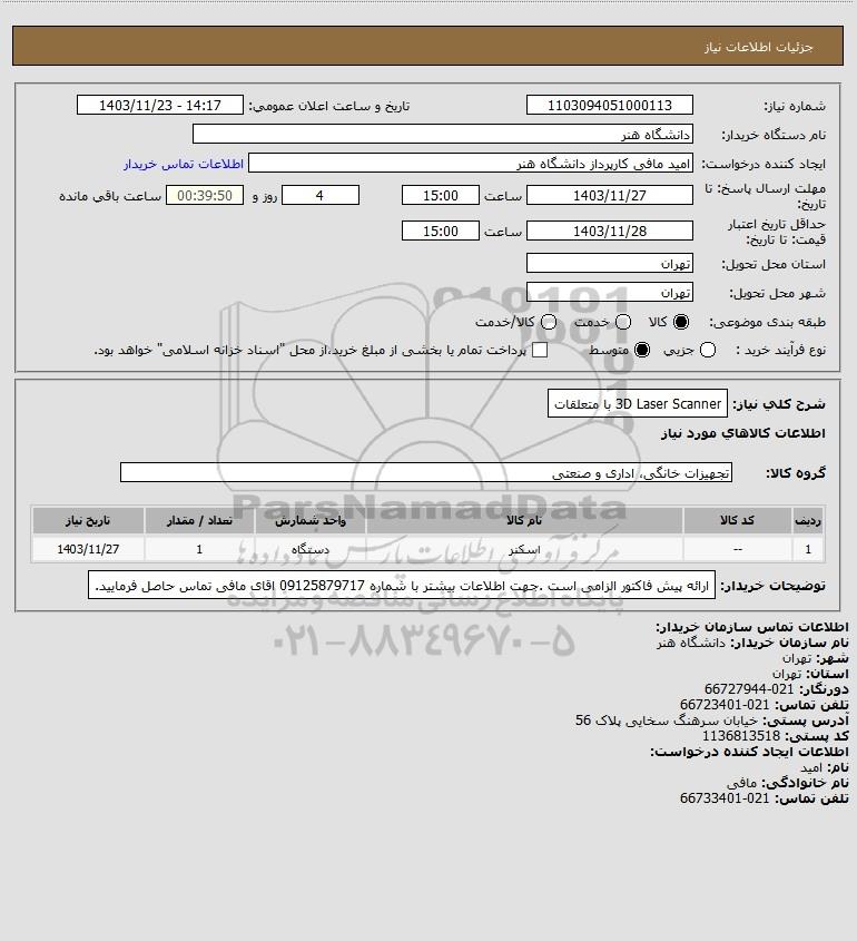 شرح کلی نیاز: 3D Laser Scanner با متعلقات