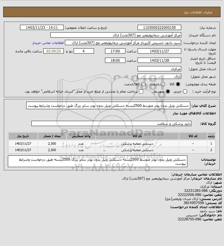شرح کلی نیاز: دستکش ونیل بدون پودر متوسط 2500بسته دستکش ونیل بدون پودر سایز بزرگ طبق درخواست وشرایط پیوست