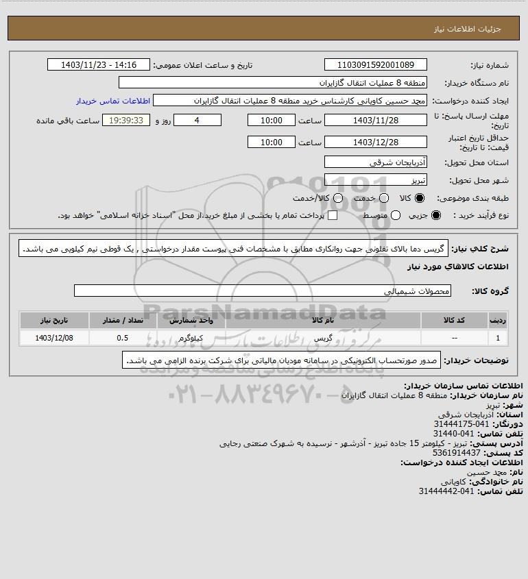 | 1 | -- | گریس | کیلوگرم | 0.5 | 1403/12/08 |