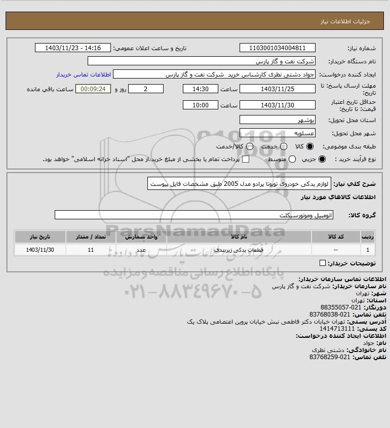 شرح کلی نیاز: لوازم یدکی خودروی تویوتا پرادو مدل 2005 طبق مشخصات فایل پیوست