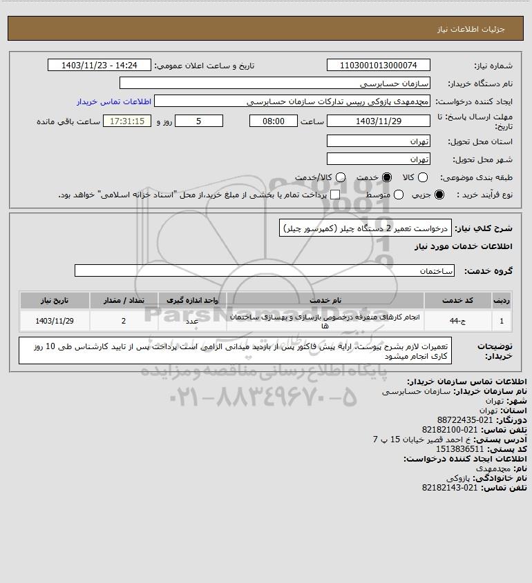 شرح کلی نیاز: درخواست تعمیر 2 دستگاه چیلر (کمپرسور چیلر)
