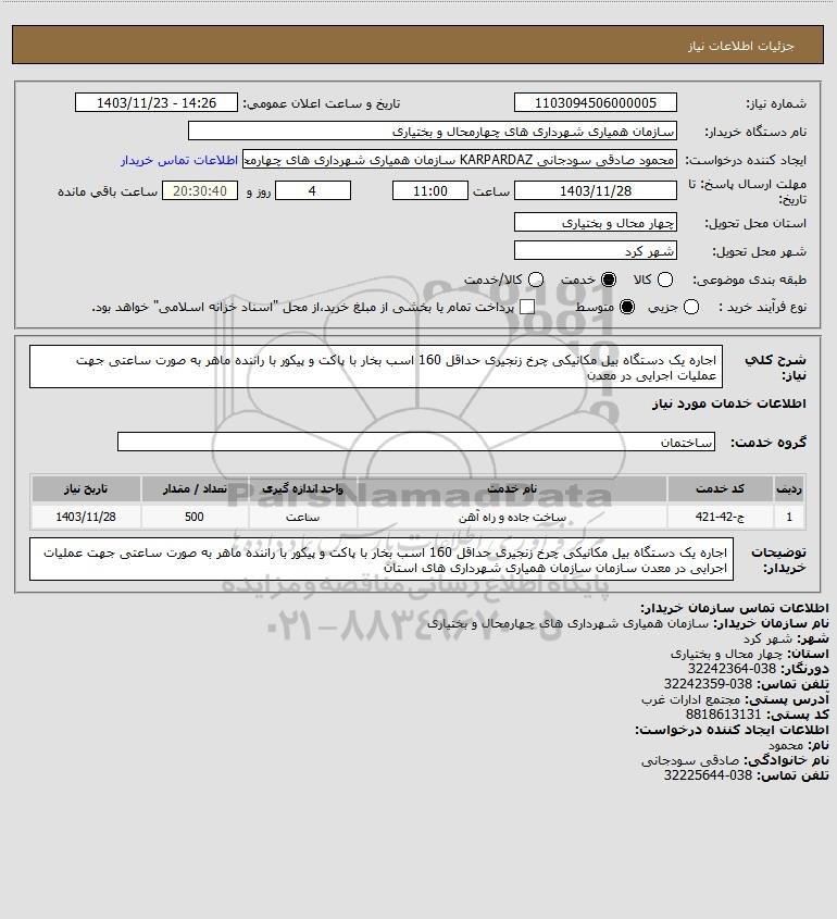 توضیحات خریدار:اجاره یک دستگاه بیل مکانیکی چرخ زنجیری حداقل 160 اسب بخار با پاکت و پیکور با راننده ماهر به صورت ساعتی جهت عملیات اجرایی در معدن سازمان سازمان همیاری شهرداری های استان