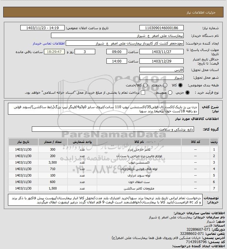 شرح کلی نیاز: درن پن رز باریک/اکسترنال فولی35/اکستنشن تیوپ 110 سانت/ایروی سایز 0و3و4/فینگر تیپ بزرگ(رابط ساکشن)/سوند فولی دو راهه 18/ست خون/ترجیحا برند سوپا