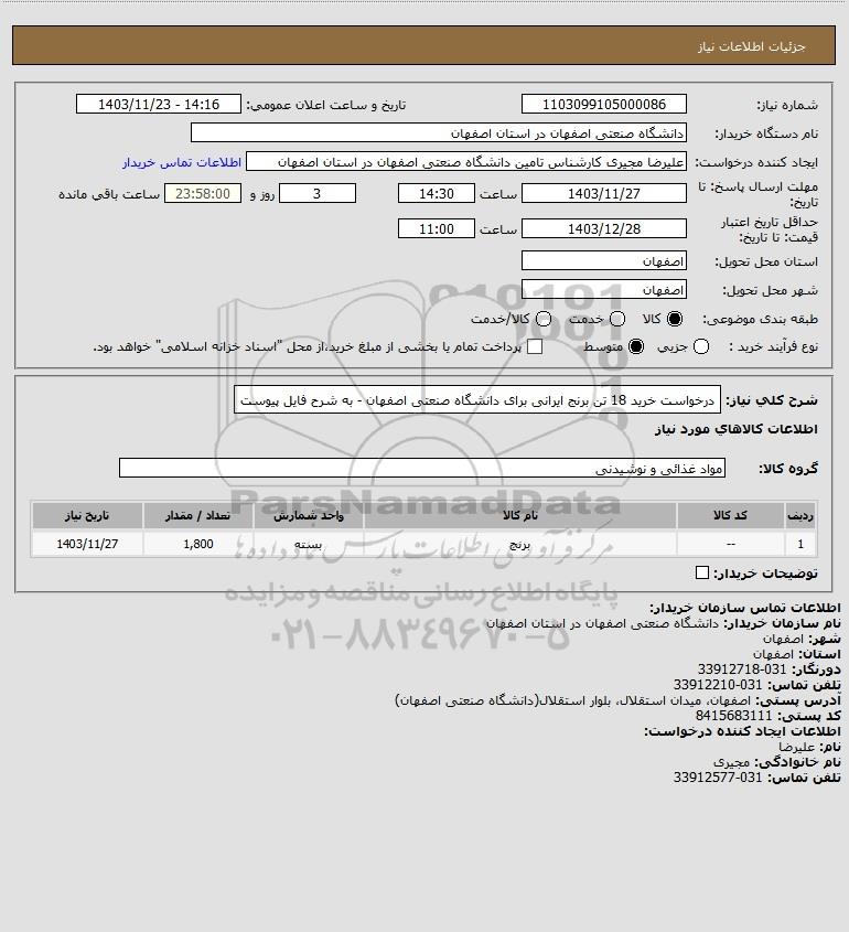 شرح کلی نیاز: درخواست خرید 18 تن برنج ایرانی برای دانشگاه صنعتی اصفهان - به شرح فایل پیوست