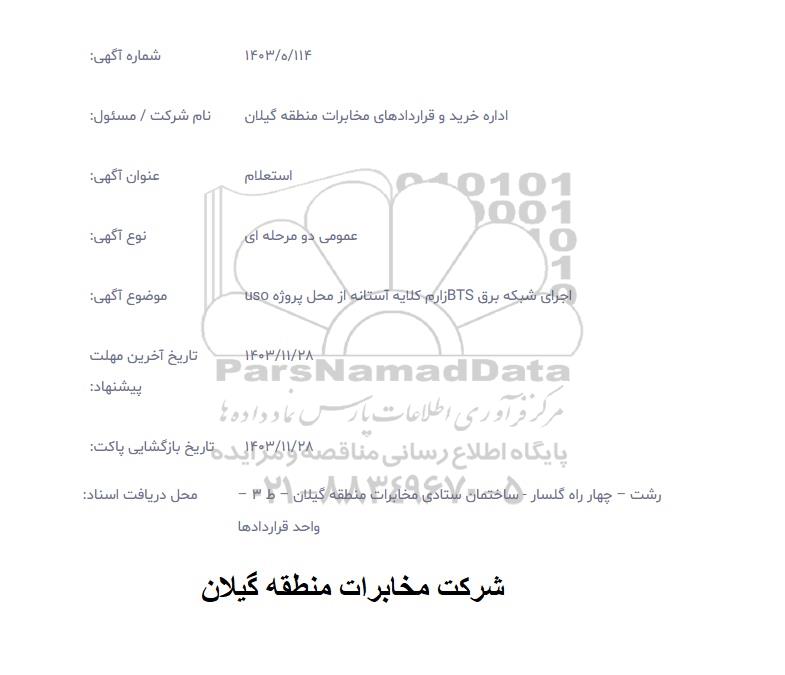 اجرای شبکه برق BTSزارم کلایه آستانه از محل پروژه uso : موضوع آگهی