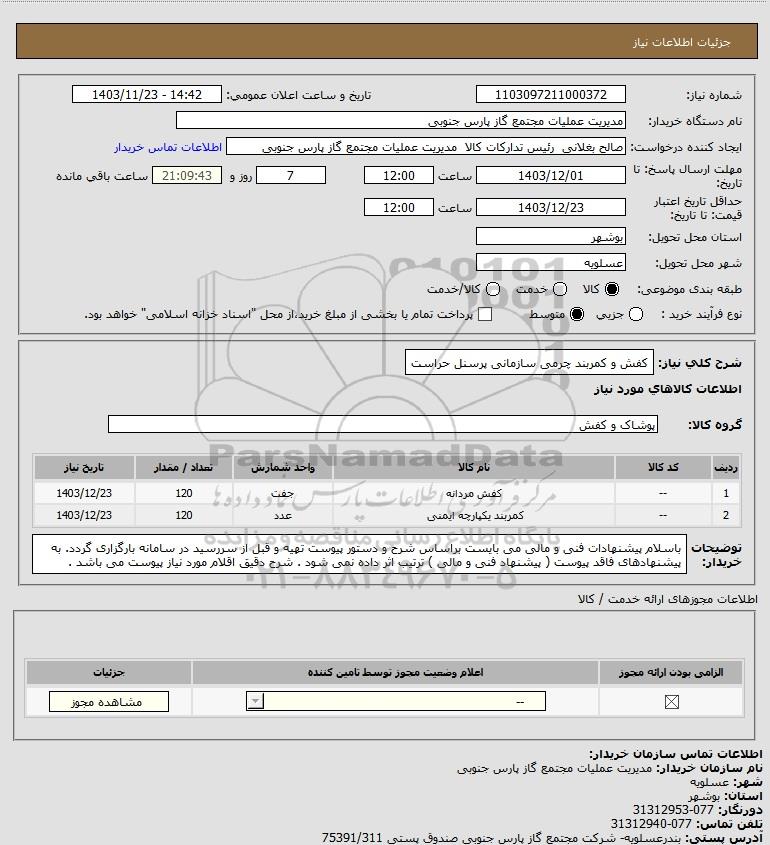 نام دستگاه خریدار:مدیریت عملیات مجتمع گاز پارس جنوبی