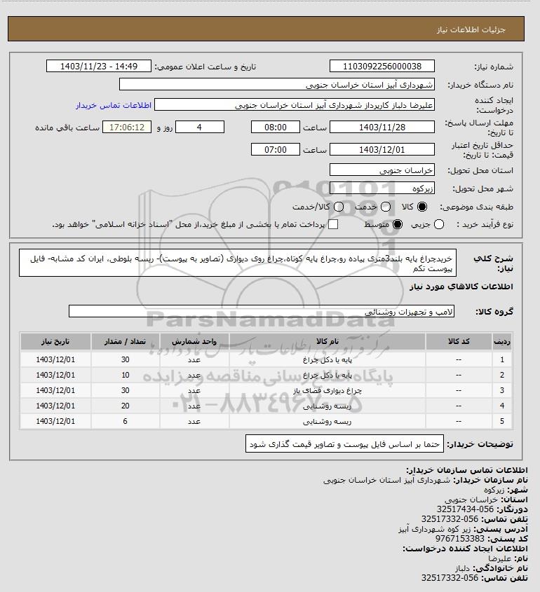 شرح کلی نیاز: خریدچراغ پایه بلند3متری پیاده رو،چراغ پایه کوتاه،چراغ روی دیواری (تصاویر به پیوست)- ریسه بلوطی، ایران کد مشابه- فایل پیوست تکم
