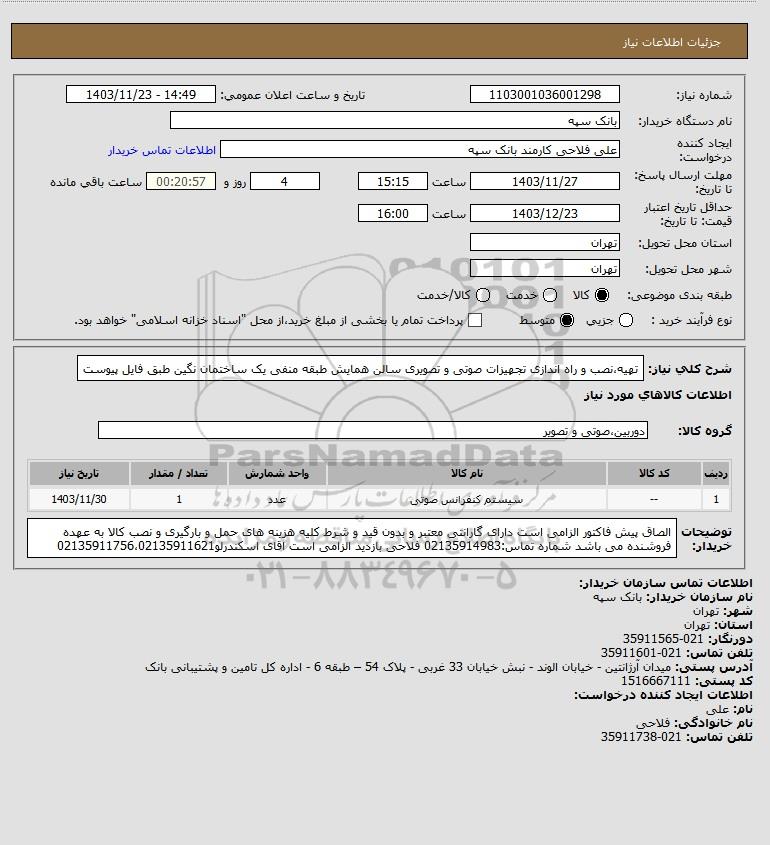 استعلام بها و موضوع استعلام استعلام تهیه،نصب و راه اندازی تجهیزات صوتی و تصویری سالن همایش طبقه منفی یک ساختمان نگین طبق فایل پیوست به اطلاع کلیه شرکت‌ها و افراد متخصص واجد شرایط می‌رساند، آگهی گذار در نظر دارد از طریق استعلام بها، نسبت به انتخاب و دریافت پیشنهادات اقدام نماید. این استعلام با کد آگهی ثبت شده در سامانه خبرگزاری پارس نماد : 8663787 منتشر شده است. مشخصات استعلام : تاریخ شروع استعلام: 1403/11/23 آخرین مهلت ارسال پیشنهاد قیمت : 1403/11/27 و محل اجرای پروژه : استان تهران میباشد. استعلام قیمت مورد درخواست : استعلام تهیه،نصب و راه اندازی تجهیزات صوتی و تصویری سالن همایش طبقه منفی یک ساختمان نگین طبق فایل پیوست با دسته‌بندی‌های تخصصی و گروه های مرتبط : صوت و تصویر - وسایل عکاسی و دیتا پرژکتور, سالن های آمفی تئاتر ، سینما و جلسات, استعلام اطلاع رسانی میگردد.