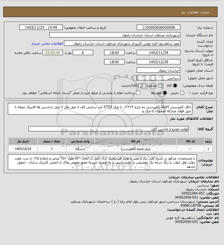 شرح کلی نیاز: اتاق کمپرسی 2624 کمپرسی ده چرخ ۲۶۲۴ - با ورق ST52 ضد سایش کف ۸ میل بغل ۶ میل شاسی ها فابریک دوبله ۸ میل فولاد مبارکه اصفهان با چک و
