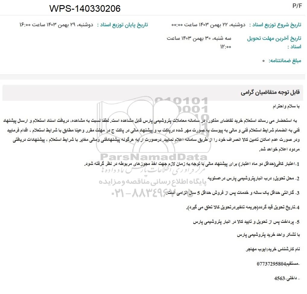 به استحضار می رساند استعلام خرید تقاضای مذکور، در سامانه معاملات پتروشیمی پارس قابل مشاهده است. لطفا نسبت به مشاهده دریافت اسناد استعلام و ارسال پیشنهاد فنی به انضمام شرایط استعلام فنی و مالی به پیوست به صورت مهر شده در پاکت ب و پیشنهاد مالی در پاکت ج در مهلت مقرر وعینا مطابق با شرایط استعلام ، اقدام فرمایید و در صورت عدم امکان تامین کالا انصراف خود را از طریق سامانه اعلام نمایید. در صورت ارایه هرگونه پیشنهاد فنی و مالی مغایر با شرایط استعلام ، پیشنهادات دریافتی مردود اعلام خواهد شد.