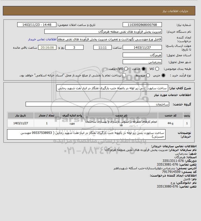 شرح کلی نیاز: ساخت ساپورت بتنی زیر لوله در باغچه جنب بارگیری نفتگاز در انبار نفت شهید رجایی