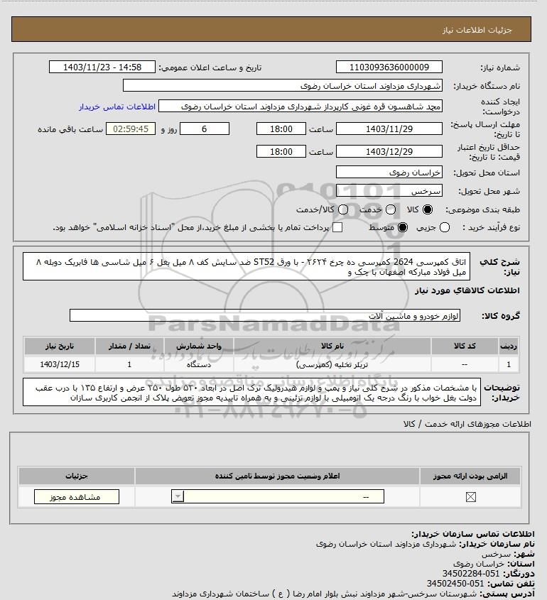 شرح کلی نیاز: اتاق کمپرسی 2624 کمپرسی ده چرخ ۲۶۲۴ - با ورق ST52 ضد سایش کف ۸ میل بغل ۶ میل شاسی ها فابریک دوبله ۸ میل فولاد مبارکه اصفهان با چک و