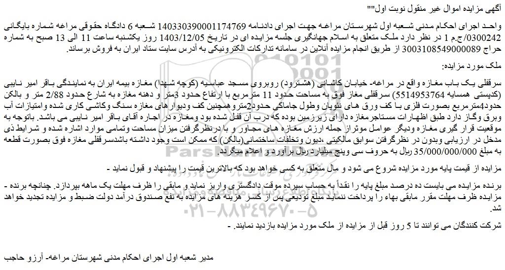 واحد اجرای احکام مدنی شعبه اول شهرستان مراغه جهت اجرای دادنامه 140330390001174769 شعبه 6 دادگاه حقوقی مراغه شماره بایگانی 0300242/ج.م 1 در نظر دارد ملک متعلق به اسلام جهانگیری جلسه مزایده ای در تاریخ 1403/12/05 روز یکشنبه ساعت 11 الی 13 صبح به شماره حراج 3003108549000089 از طریق انجام مزایده آنلاین در سامانه تدارکات الکترونیکی به آدرس سایت ستاد ایران به فروش برساند.