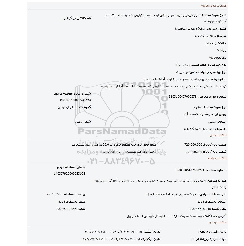 مزایده عمومی مزایده فروش و مزایده روغن نباتی نیمه جامد 5 کیلویی لادن به تعداد 240 عدد آفتابگردان تراریخته برگزار میگردد. از کلیه افراد متخصص و شرکتهای واجد شرایط دعوت به عمل میآید تا در این مزایده با کد خبرگزاری پارس نماد : 8666022 شرکت نمایند تاریخ شروع مزایده : 1403/11/24 مهلت شرکت در مزایده: تا پایان روز 1403/12/05