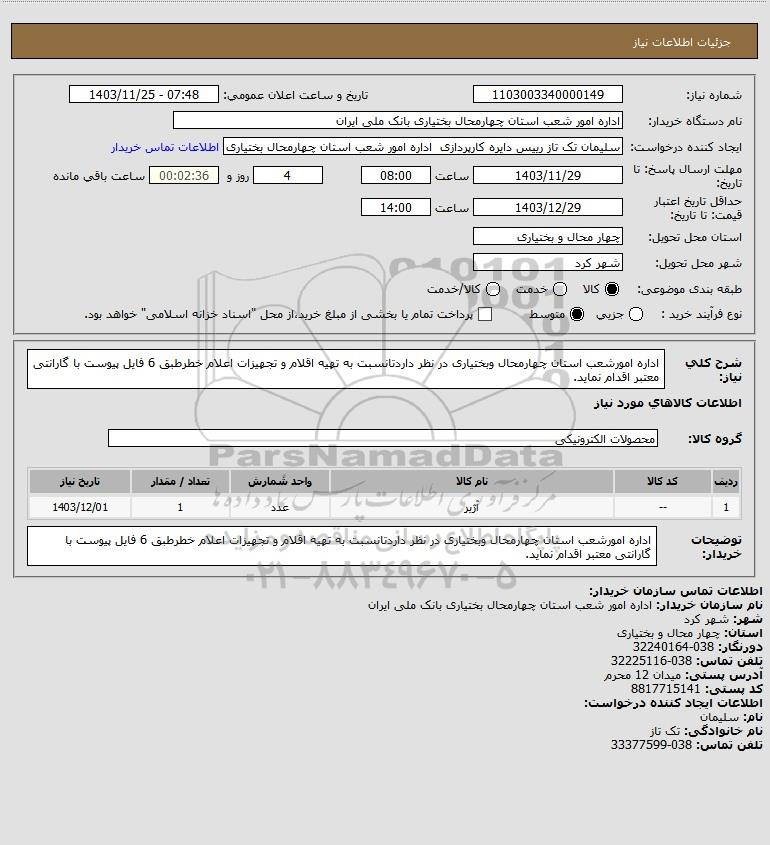 شرح کلی نیاز: اداره امورشعب استان چهارمحال وبختیاری در نظر داردتانسبت به تهیه اقلام و تجهیزات اعلام خطرطبق 6 فایل پیوست با گارانتی معتبر اقدام نماید.
