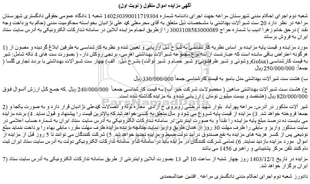 شعبه دوم اجرای احکام مدنی شهرستان مراغه جهت اجرای دادنامه شماره 140230390011719304 شعبه 1 دادگاه عمومی حقوقی دادگستری شهرستان مراغه در نظر دارد 20 ست شیرآلات بهداشتی با مشخصات ذیل متعلق به آقای محرمعلی محمد علی نژادیان بخواسته محکومیت مدنی (حکم به پرداخت وجه نقد ) درحق خانم زهرا ادیب با شماره حراج 3003108583000089 را ازطریق انجام مزایده آنلاین در سامانه تدارکات الکترونیکی به آدرس سایت ستاد ایران به فروش برساند