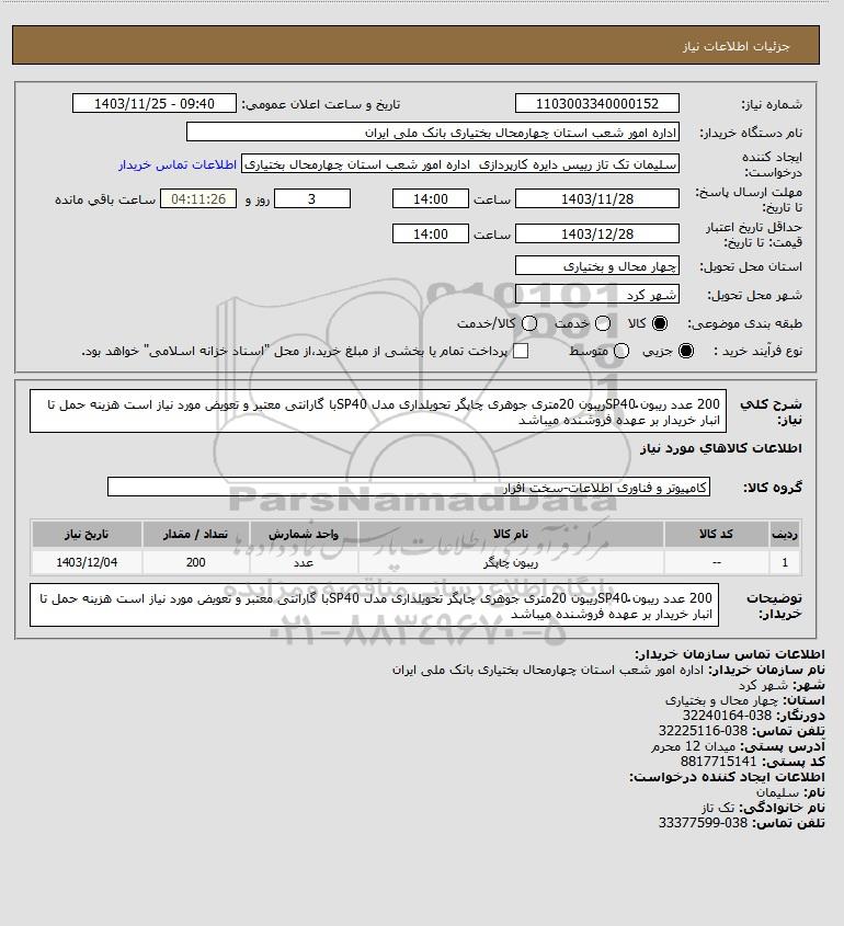 شرح کلی نیاز: 200 عدد ریبون ُSP40ریبون 20متری جوهری چاپگر تحویلداری مدل SP40با گارانتی معتبر و تعویض مورد نیاز است هزینه حمل تا انبار خریدار بر عهده فروشنده میباشد