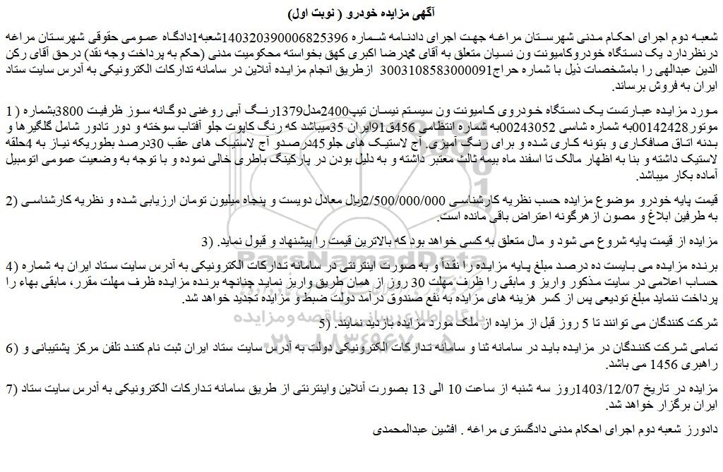 شعبه دوم اجرای احکام مدنی شهرستان مراغه جهت اجرای دادنامه شماره 140320390006825396شعبه1دادگاه عمومی حقوقی شهرستان مراغه درنظردارد یک دستگاه خودروکامیونت ون نسیان متعلق به آقای محمدرضا اکبری کهق بخواسته محکومیت مدنی (حکم به پرداخت وجه نقد) درحق آقای رکن الدین عبدالهی را بامشخصات ذیل با شماره حراج3003108583000091  ازطریق انجام مزایده آنلاین در سامانه تدارکات الکترونیکی به آدرس سایت ستاد ایران به فروش برساند.