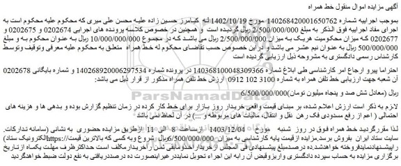 بموجب اجراییه شماره 140268420001650762 مورخ 1402/10/19 له کیامرز حسین زاده علیه محسن علی میری که محکوم علیه محکوم است به اجرای مفاد اجراییه فوق الذکر به مبلغ 2/500/000/000 ریال گردیده است و همچنین در خصوص کلاسه پرونده های اجرایی 0202674 و 0202675 و 0202677 که میزان محکومیت هریک به میزان 2/500/000/000 ریال می باشد که در مجموع 10/000/000/000 ریال به عنوان محکوم به و مبلغ 500/000/000 ریال به عنوان نیم عشر می باشد و دراین خصوص حسب تقاضای محکوم له خط همراه متعلق به محکوم علیه معرفی وتوقیف وتوسط کارشناس رسمی دادگستری به مشروحه ذیل ارزیابی گردیده است