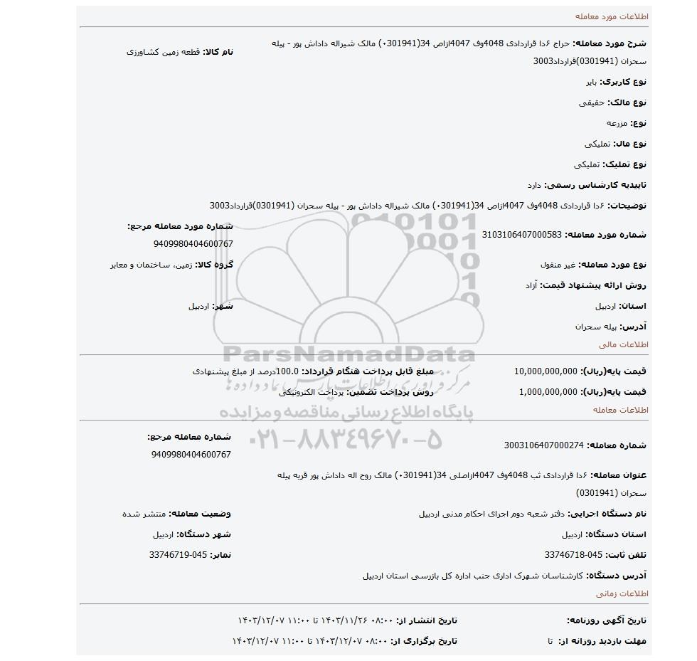 عنوان معامله: ۶دا قراردادی ثب 4048وف 4047ازاصلی 34(۰301941) مالک روح اله داداش پور قریه پیله سحران (0301941) | ||