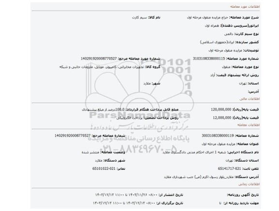 | شرح مورد معامله: حراج مزایده منقول مرحله اول | نام کالا: سیم کارت | |