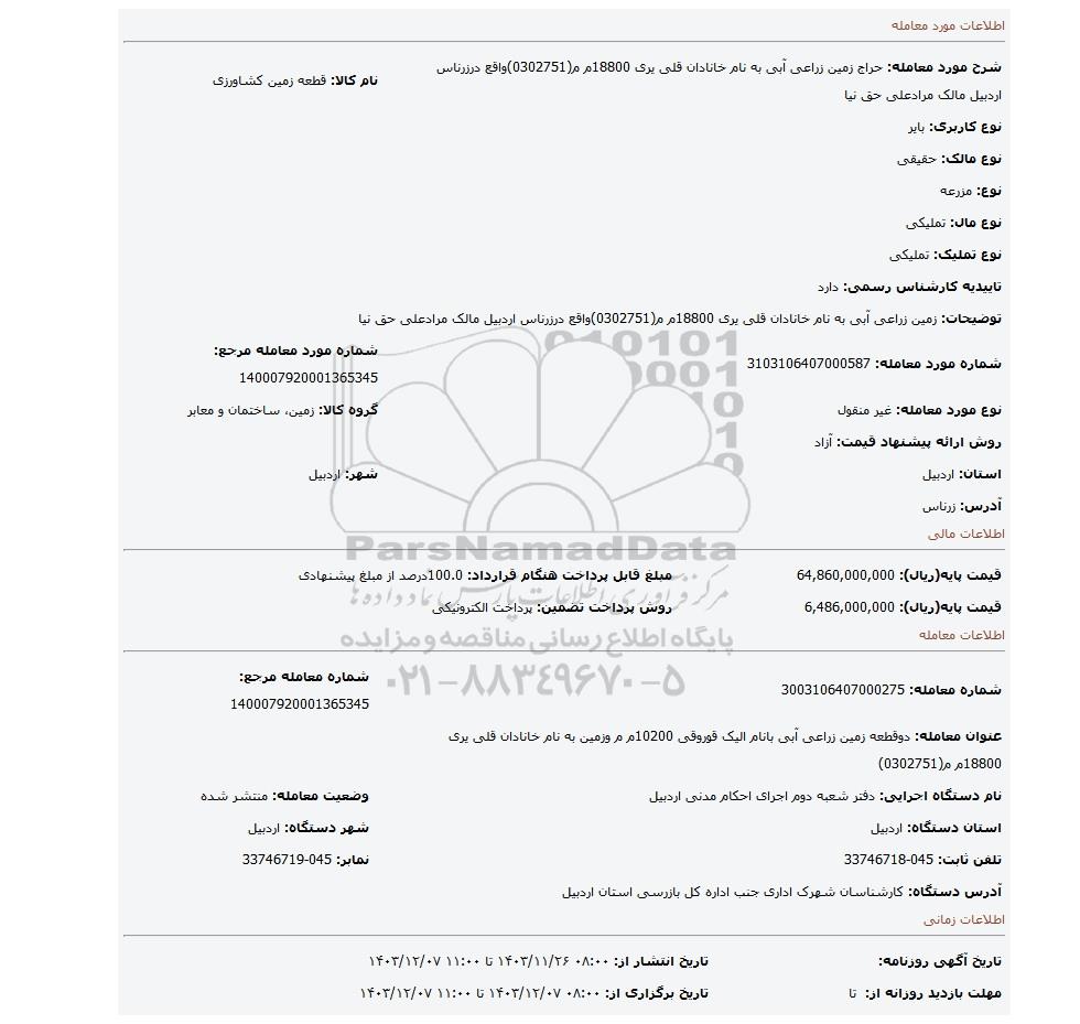 شرح مورد معامله: حراج زمین زراعی آبی به نام خانادان قلی یری 18800م م(0302751)واقع درزرناس اردبیل مالک مرادعلی حق نیا | نام کالا: قطعه زمین کشاورزی | |