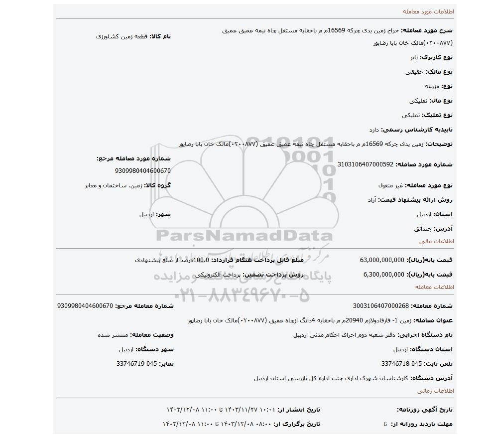 شماره مورد معامله: 3103106407000592 | شماره مورد معامله مرجع: 9309980404600670 | |
