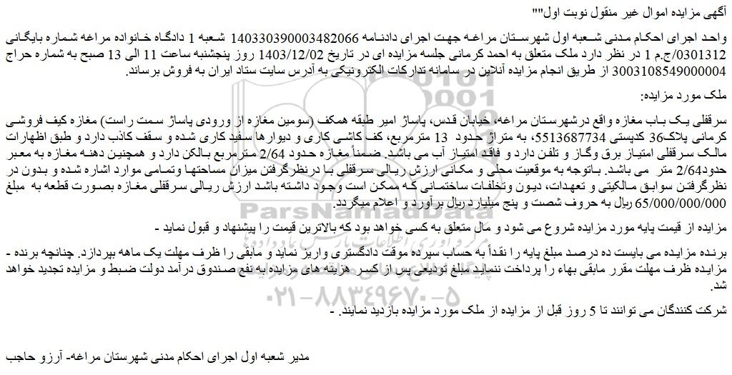 واحد اجرای احکام مدنی شعبه اول شهرستان مراغه جهت اجرای دادنامه 140330390003482066 شعبه 1 دادگاه خانواده مراغه شماره بایگانی 0301312/ج.م 1 در نظر دارد ملک متعلق به احمد کرمانی جلسه مزایده ای در تاریخ 1403/12/02 روز پنجشنبه ساعت 11 الی 13 صبح به شماره حراج 3003108549000004 از طریق انجام مزایده آنلاین در سامانه تدارکات الکترونیکی به آدرس سایت ستاد ایران به فروش برساند.
