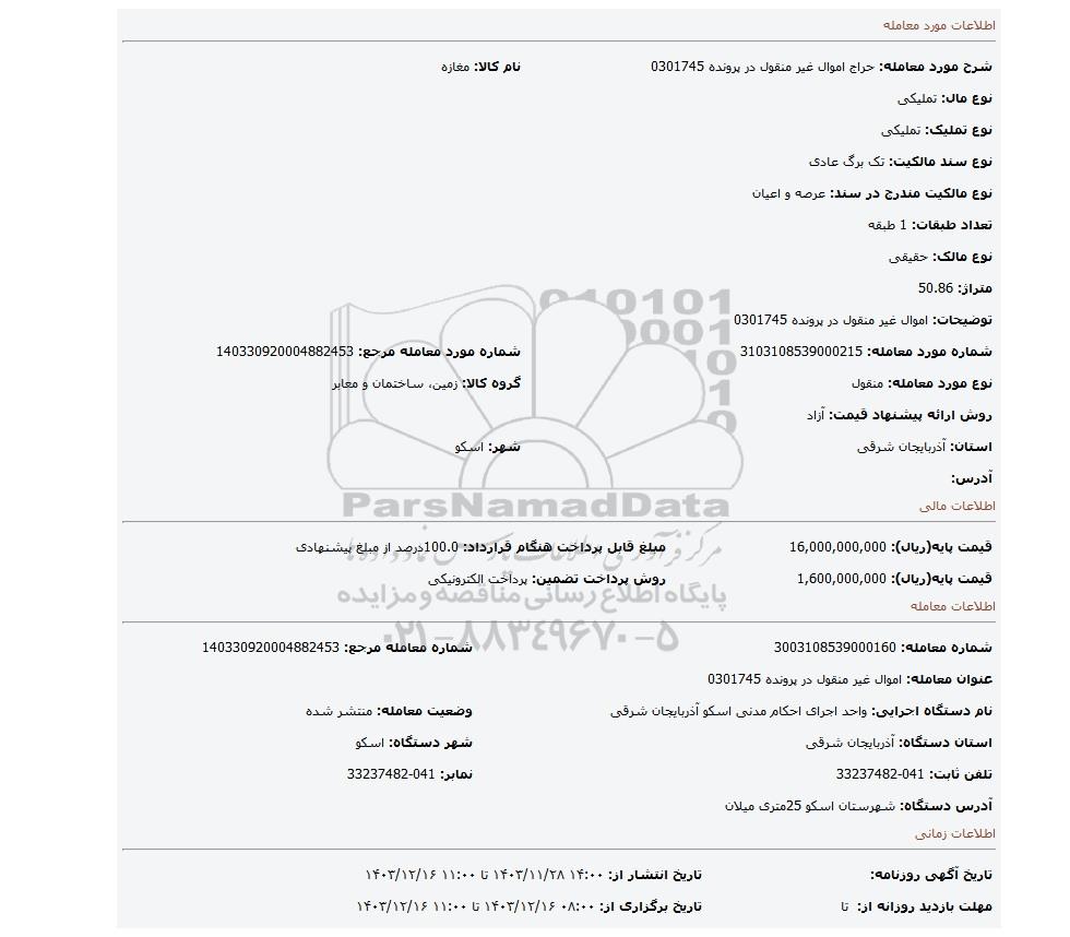 | عنوان معامله: اموال غیر منقول در پرونده 0301745 | ||