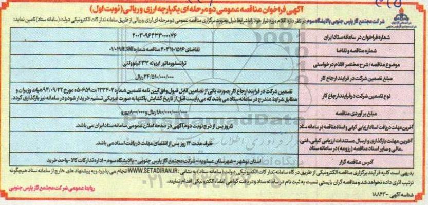 موضوع مناقصه/ شرح مختصر اقلام درخواستی: ترانسفورماتور ایزوله 33 کیلوولتی