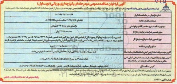 آگهی فراخوان مناقصه عمومی دو مرحله ای یکپارچه ارزی و ریالی