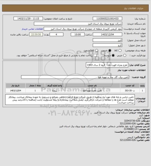 شرح کلی نیاز: طرح بحران الویت یک - گروه 2 سال 1403