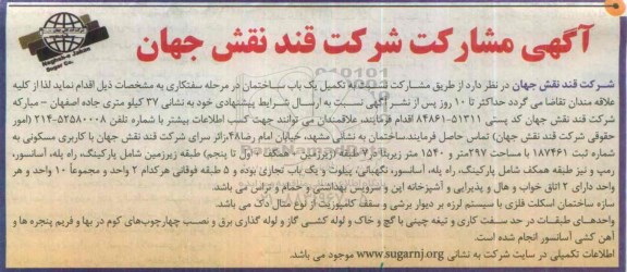 شرکت نقش جهان در نظر دارد از طریق مشارکت نسبت به تکمیل یک باب ساختمان در مرحله سفتکاری به مشخصان ذیل اقدام نمایند لذا از کلیه علاقمندان تقاضا می گردد حداکثر تا 10 رو پس از نشر آگهی نسبت به ارسال شرایط پیشنهادی خود به نشانی 37 کیلومتری جاده اصفهان - مبارکه شرکت قند نقش جهان کد پستی 51311-84861 اقدام فرمایند علاقمندان میتوانند جهت کسب اطلاعات بیشتر با شماره تلفن 52580008-214 امور حقوقی شرکت قند نقش جهان تماس حاصل نمایند ساختمان به نشانی مشهد خیابان امام رضا 48 , زائر سرای شرکت قند نقش جهان با کاربری مسکونی به شماره ثبت 187461 با مساحت 297 متر و 1520 متر زیربنا در 7 طبقه ( زیرزمین +همکف +اول تا پنجم ) طبقه زیرزمین شامل پارکینگ , راه پله, آسانسور ,رمپ و نیز طبقه همکف شامل پارکینگ , راه پله , آسانسور , نگهبانی پیلوت و یک باب تجاری بوده و 5 طبقه فوقانی هرکدام 2 واحد و مجموعا 10 واحد و هر واحد دارای 2 اتاق خواب و هال و پذیرایی و آشپزخانه اپن و سرویس بهداشتی و حمام و تراس می باشد