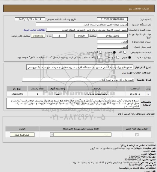 شرح کلی نیاز: اصلاح تابلو برق و سیم کشی مسیر برق درمانگاه قایم با شرایط مطابق تو ضیحات درج در مدارک پیوستی