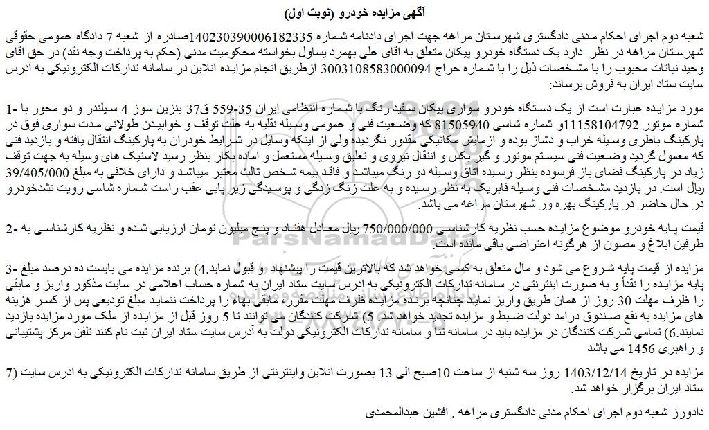 شعبه دوم اجرای احکام مدنی دادگستری شهرستان مراغه جهت اجرای دادنامه شماره 140230390006182335صادره از شعبه 7 دادگاه عمومی حقوقی شهرستان مراغه در نظر دارد یک دستگاه خودرو پیکان متعلق به آقای علی بهمرد یساول بخواسته محکومیت مدنی (حکم به پرداخت وجه نقد) در حق آقای وحید نباتات محبوب را با مشخصات ذیل را با شماره حراج 3003108583000094 ازطریق انجام مزایده آنلاین در سامانه تدارکات الکترونیکی به آدرس سایت ستاد ایران به فروش برساند: