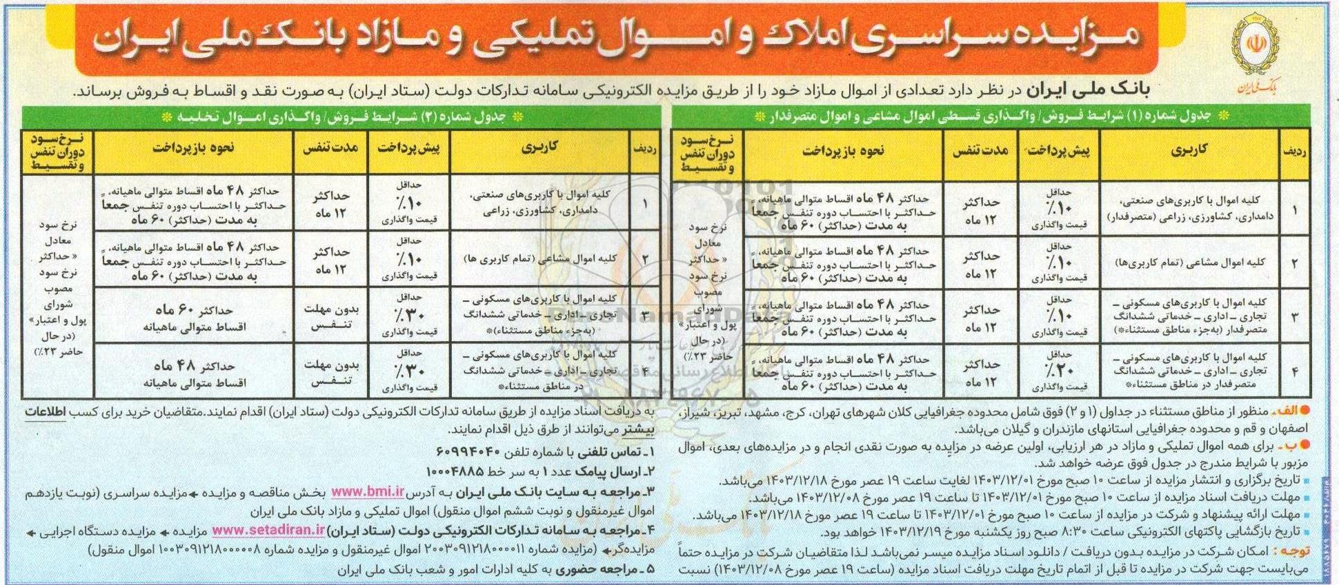 مزایده سراسری املاک و اموال تملیکی و مازاد بانک ملی ایران