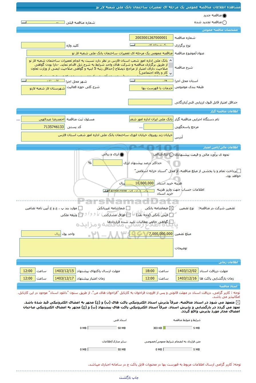 | عنوان/موضوع مناقصه | مناقصه عمومی یک مرحله ای تعمیرات ساختمان بانک ملی شعبه لار نو | ||