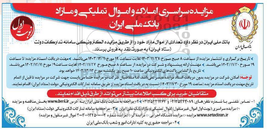 مزایده سراسری املاک و اموال تملیکی و مازاد بانک ملی ایران - نوبت اول