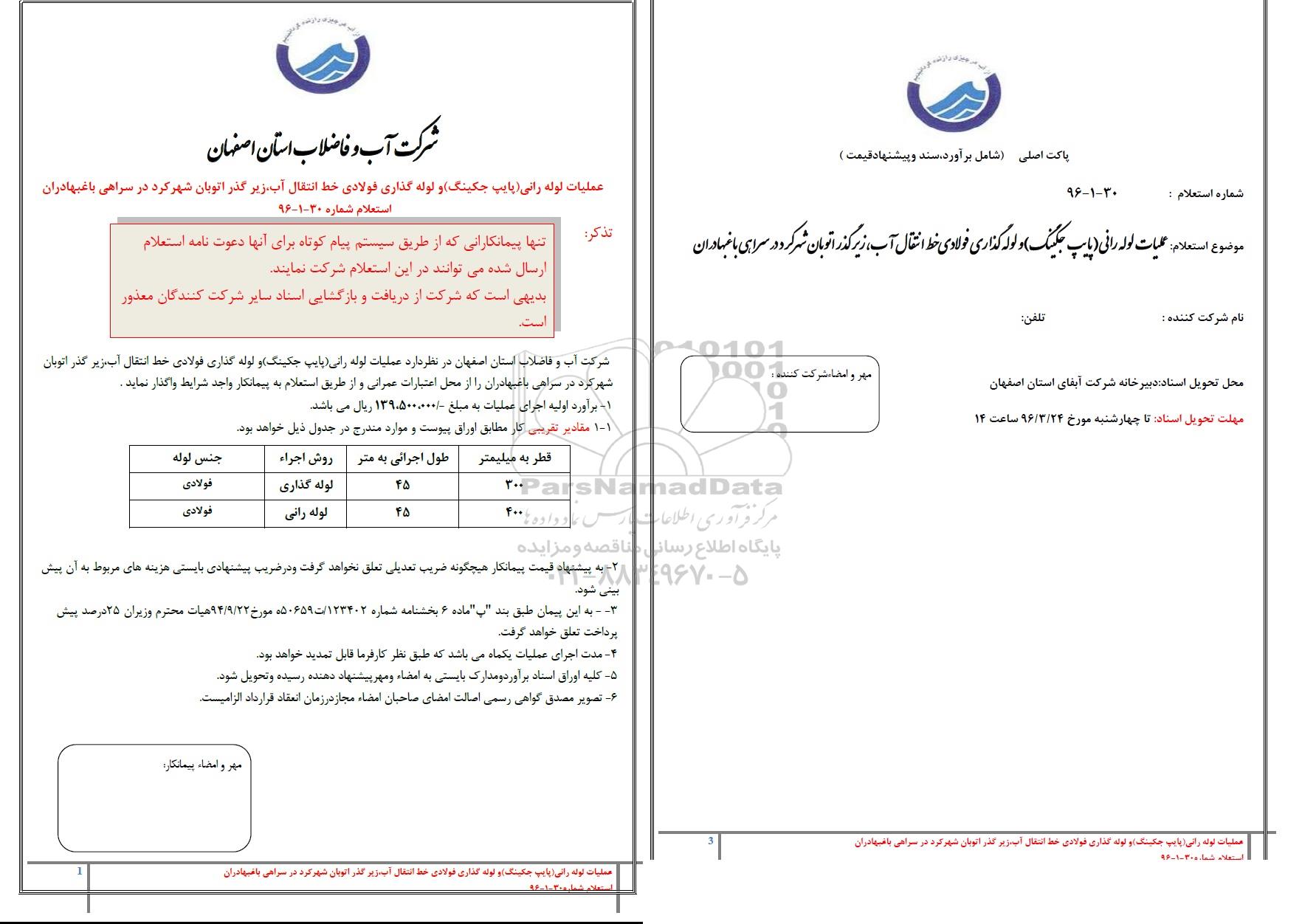 شرکت آب و فاضلاب استان اصفهان در نظر دارد عملیات لوله رانی (پایپ جکینگ) و لوله گذاری فولادی خط انتقال آب، زیرگذر اتوبان شهرکرد در سراهی باغبهادران را از محل اعتبارات عمرانی و از طریق استعلام به پیمانکار واجدشرایط واگذار نماید.