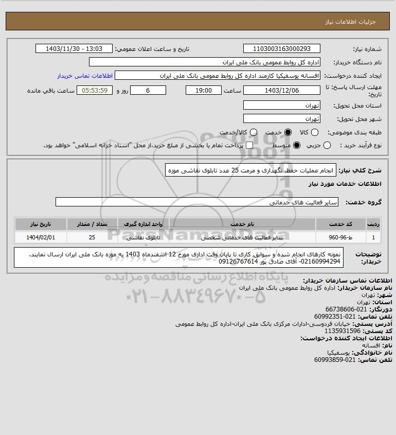 شرح کلی نیاز: انجام عملیات حفظ، نگهداری و مرمت 25 عدد تابلوی نقاشی موزه