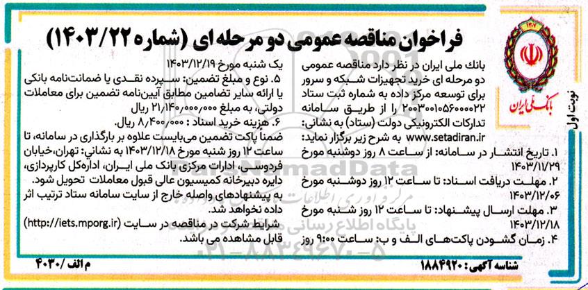 بانک ملی ایران در نظر دارد مناقصه عمومی دو مرحله ای خرید تجهیزات شبکه و سرور برای توسعه مرکز داده به شماره ثبت ستاد 2003001056000022 را از طریق سامانه تدارکات الکترونیکی دولت ستاد) به نشانی سایت ستاد ایران به شرح زیر برگزار نماید.